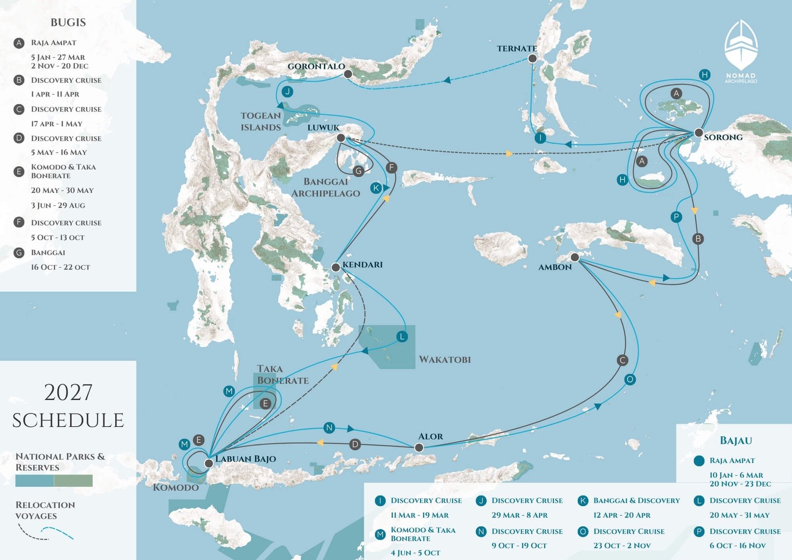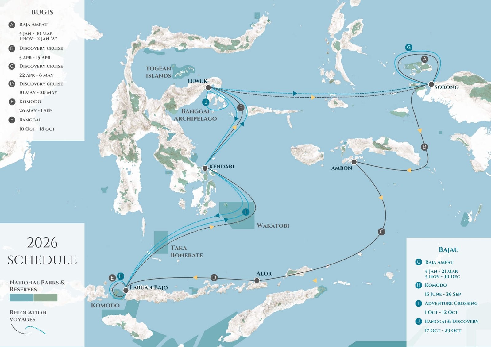 Our cruises follow the seasons, shifting slowly between Indonesia’s richest marine regions. In 2026, both Bugis and Bajau will journey between Komodo, Raja Ampat, and the Banggai Archipelago, with inter-season crossings through remote areas like Wakatobi, Taka Bonerate, and Halmahera.