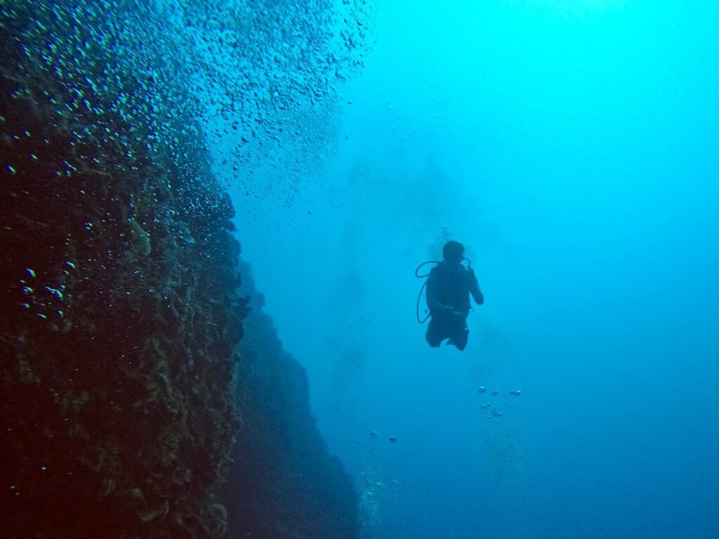 Out here, we learn quickly that movement shapes everything. When the water is still, the reef feels quiet; when the current flows, the drop-offs come alive. On the days when conditions lined up, we saw whitetip reef sharks — including juveniles resting in caves — along with yellowfin and dogtooth tuna, a variety of snappers, turtles, batfish, and even a young tiger shark passing through the blue.