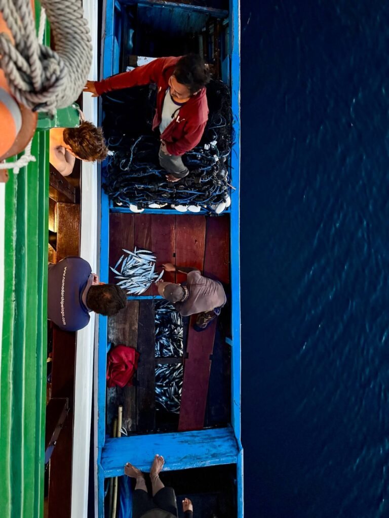 Late one afternoon, as the light softened over the water, a blue wooden boat pulled alongside us. A small group of Bajau fishers stood on the deck, their nets coiled neatly behind them and fresh flying fish arranged in silver piles across the worn planks. They greeted us with quiet smiles, holding up their catch for us to see.