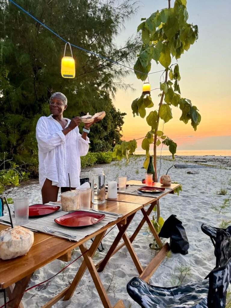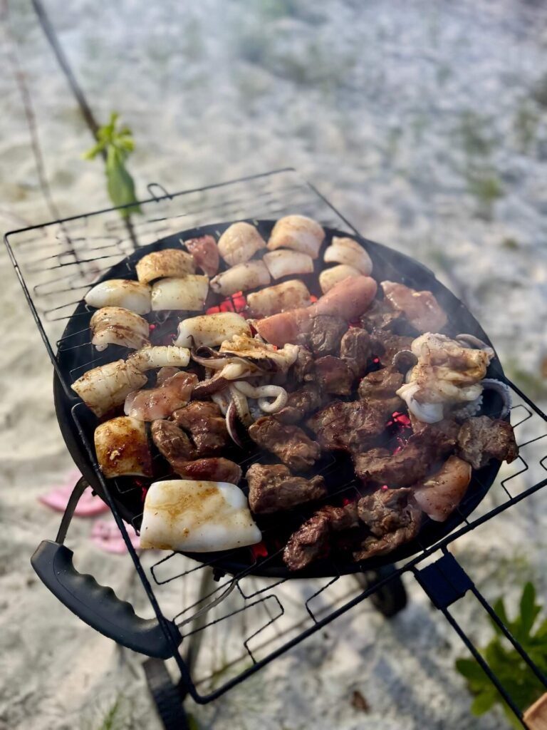 One evening the crew set up a long table on a quiet stretch of sand, hanging lanterns between the trees as the sky shifted through soft shades of orange and pink. Coconuts were opened, plates laid out, and the small grill began to smoke with squid, beef, chicken, and vegetables.